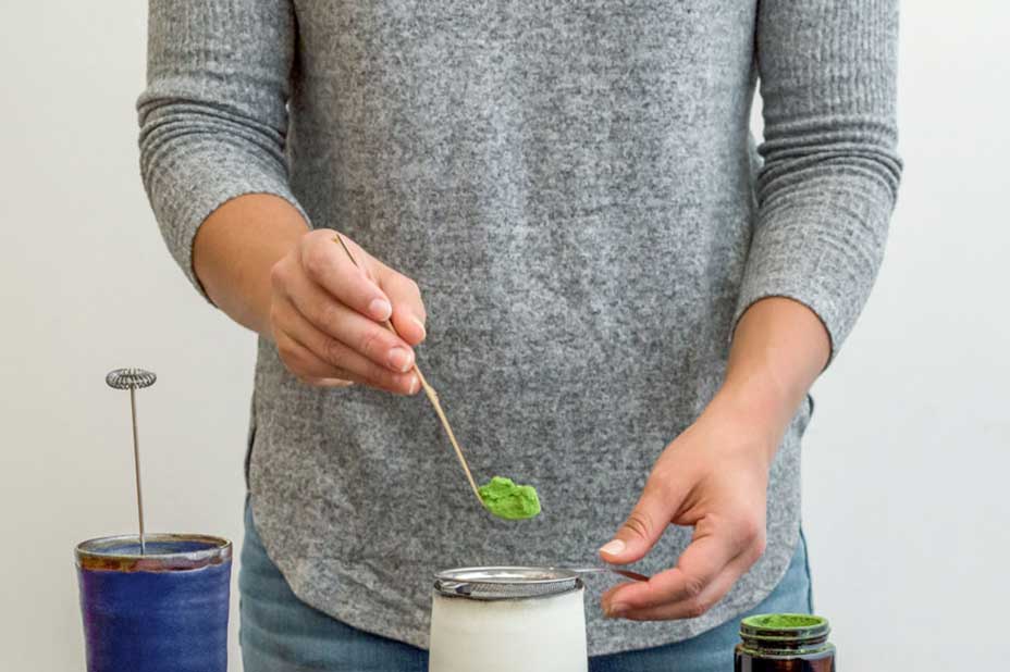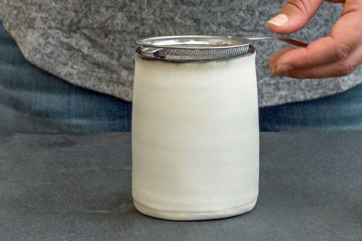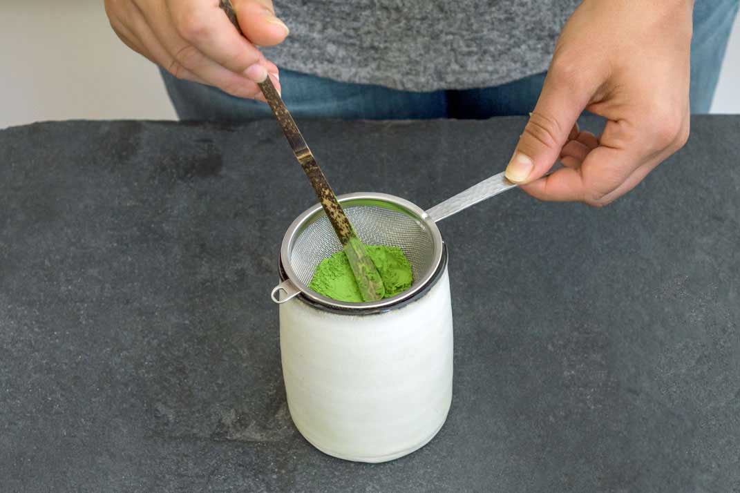 Using a scoop, add 1g. (1/2 tsp.) or more matcha into the sieve.